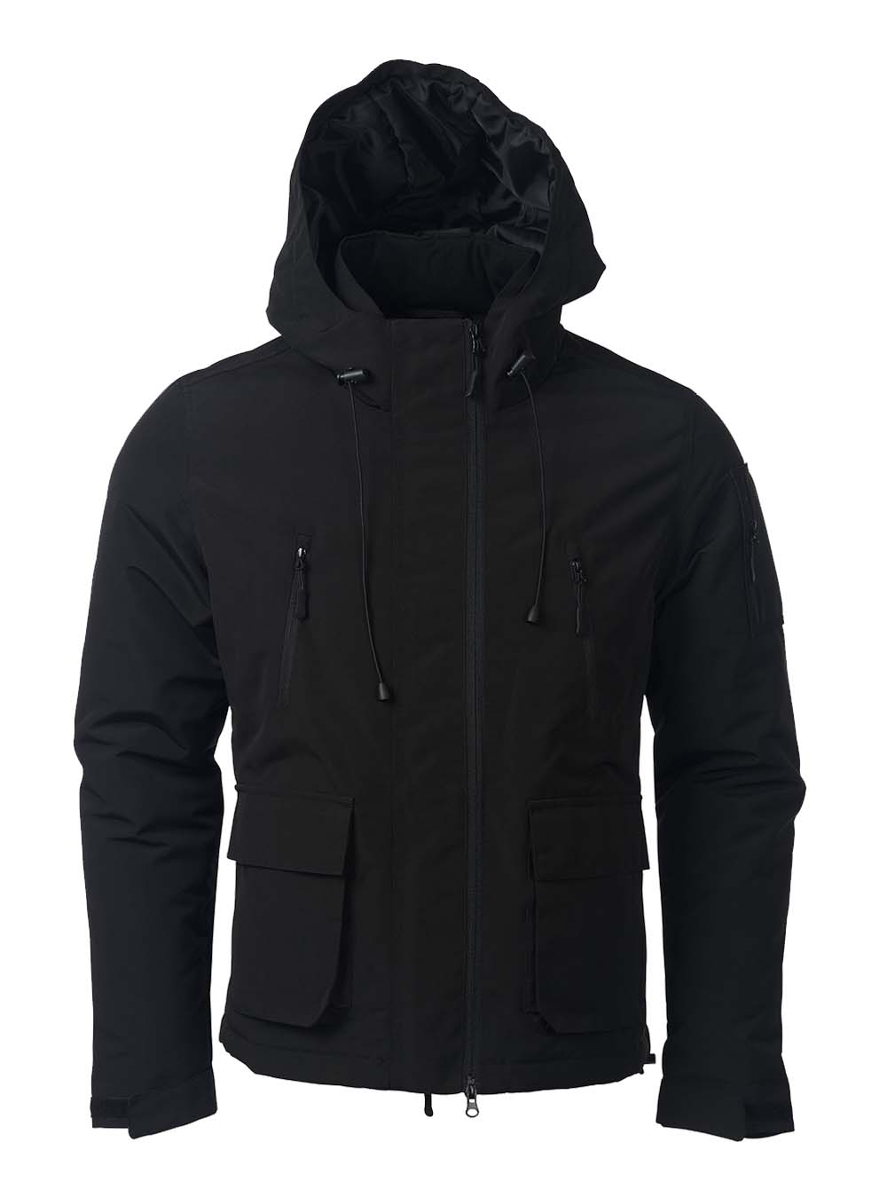 Utility-style bellow pockets with flaps, snap studs and additional side entry zippered pockets